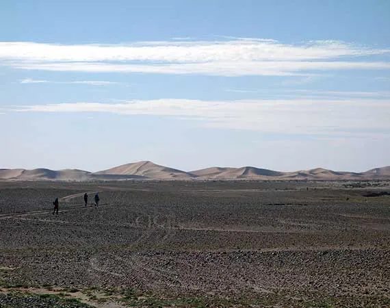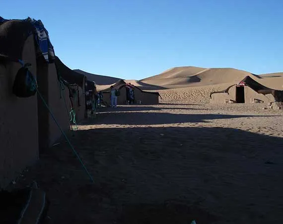 Start off the day with a hike towards the south, look far away into the distant desert plain and the mountain ranges dominated by the sand. Have an overnight in a desert camp in Oued Lamhaser.
