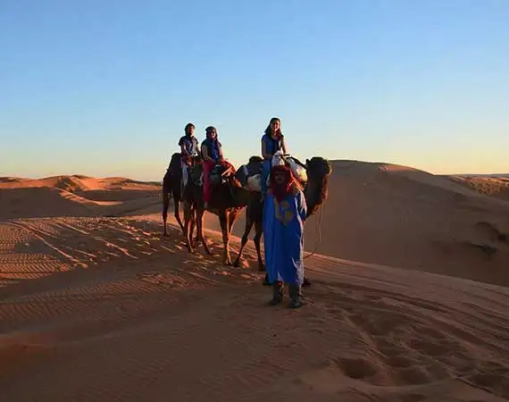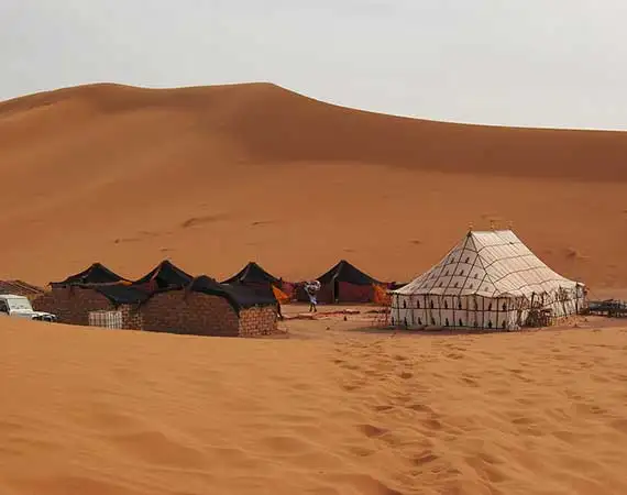 Rise early in the morning for breakfast and ride camels for 2h45 to M`hamid. Enjoy lunch in a nice authentic hotel by the palm grove. Then later, set off on a 60 km trail to the largest dunes of Chegaga where you will be served a well-deserved hearty dinner and rest for the night in a desert camp in the heart of the dunes.