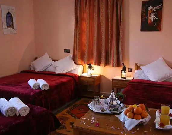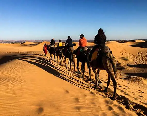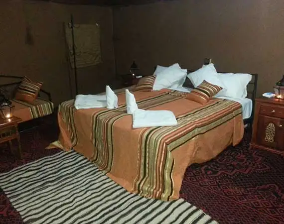 Today`s journey will touch down at the city of Erfoud, the starting of your desert expedition to Merzouga, brilliantly knowns for its high sandy dunes at the gates of the Sahara. Once you arrive, stretch your legs in the nearby hostel at the edge of the desert, then hop on your camel for a thrilling ride to Erg Chebbi camp. Meet Sahraoui people over mint tea, then have a personal time gazing at the beautiful sunset, then go enjoy your new dinner with celebration with locals with folklore dancing and songs. Spend the best night within the dunes.