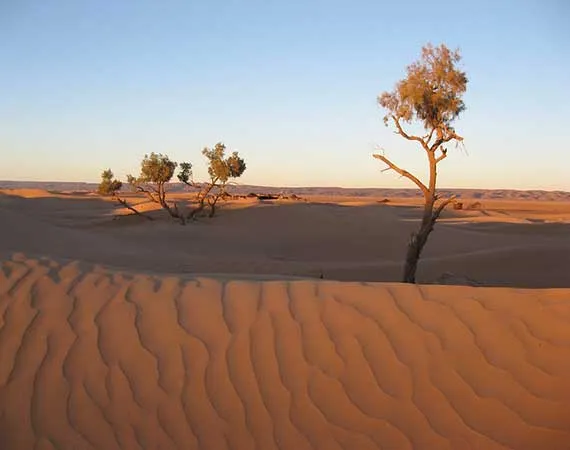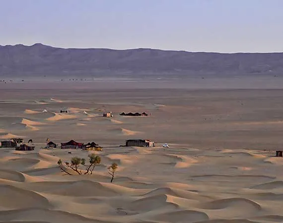 Begin today`s journey from M`hamid early at 08:30 on the back of camels, and make your way across diverse desert landscapes from dunes, and mountains to wells. Reach Ras Erich desert camp, pause and admire the sunset, have dinner and overnight at the camp.