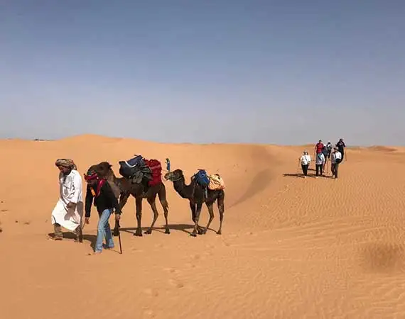 Go ahead on a trip from Mhamid riding camels and spend the best night in a desert camp settled among the sandy dunes. On the back of your camel, your ride across amazing diverse desert landscapes from dunes, and mountains to wells in the middle of arid land. This is a unique rich trekking tour in the Moroccan Sahara and is a great chance to experience the "one thousand and one-night" moment.