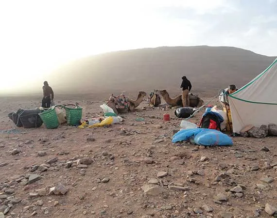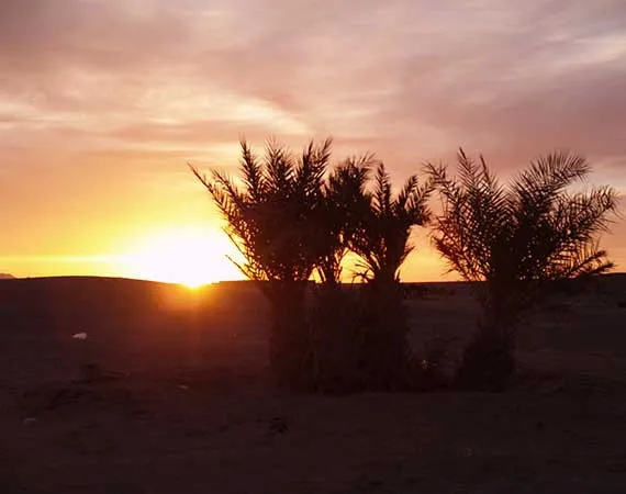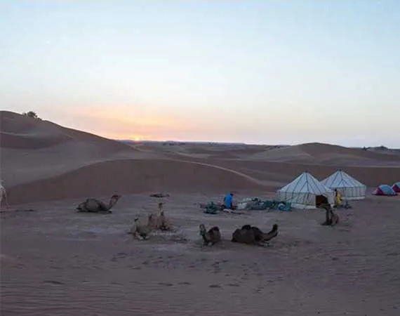 Have a desert stayover in camp – Enjoy riding a camel – Explore Faija a desert covered with acacias and camel grass – Have a picnic in Faija – Travel across the Djebel Ban and discover N'Djiniya mountain pass – Admire the spectacular view of Draa Valley – Uncover hamada and acacias – Walk about freely and spend a good night at the foot dunes of Oued Naam – Find delight in a trip to M'hamid and see of Reg Moulili.