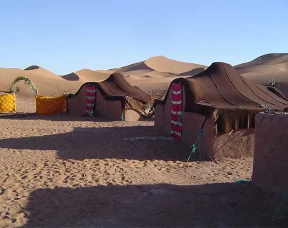 Head straight for Erg Chegaga, with the greatest dunes that read till 300m in height and 40km in length, the voyage will start off from M`hamid in the seats of 4x4. You will travel across a breathtaking landscape made of partly palm groves and oases stretched out all over the region and partly much diverse natural elements along the journey up until the sacred oasis. In this exact spot, you will be amazed to see deserted land home to a few palm trees middled with an all year flowing river where you will have a picnic. Surely, you will be captivated by the charming features of this wild exotic spot before even seeing the dunes of Erg Chegaga. Once you are in the desert, walk on the cool dunes or pick a camel for a nomadic ride, spare some time to stop and stare at the marvellous sunset, then try out some local food, and spend a serene night in camp sleeping in comfortable beds.