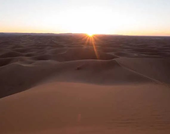 Hop on your camel and make your way through 10km of simple dunes along with 2 hours of walking. Enjoy lunch under the shades of a tamarisk tree. Then, a 4x4 comes along around 3 pm, you jump in your seat with your luggage in the trunk and set off on your desert adventure all over large dunes and amazing landscapes until you end up in the sacred oasis. Stroll in the shades of the few palm trees sided by following chilly rivers flowing all over the year. Go for another 15km to reach the stunning grand dunes of Erg Chegaga, look in awe at the 300m high and 40km long dunes while the sun is setting in slow motion. Tuck in dinner and have a peaceful night in your tent under a canopy of stars.