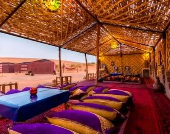 Early at 08:00, we start our journey in 4x4 from Ouarzazate to Tinghir crossing the lush oasis of Skoura and then through the valley of roses and Dades valley. Reach Todgha Gorges for some exploration before lunch on the spot. In the afternoon head towards Erfoud from which you make your way to the nearby marvellous Merzouga dunes. Ride your camel over the dunes of Erg Chebbi for around 1 hour and a half until you wind up at your camp where you will feast on a locally made dinner and overnight in the camp at the edge of the sandy dunes.