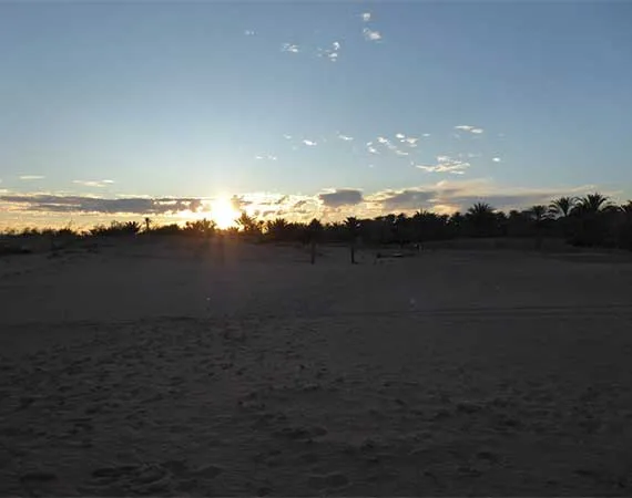 In the evening at around 4 pm, after meeting the cameleer in Zagora we start off our camel expedition towards the stunning sandy dunes of Nakhla, locally called Nkhlia, which is a bit far from Zagora with about 7km, have the time for a sunset pause, tuck in a locally made dinner and have a good night in a nomadic tent.