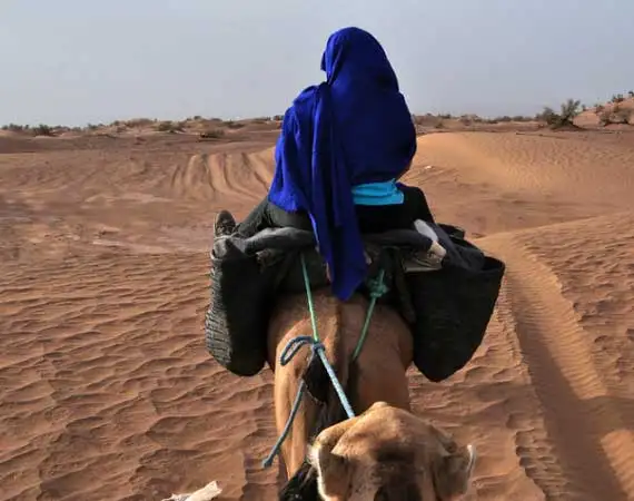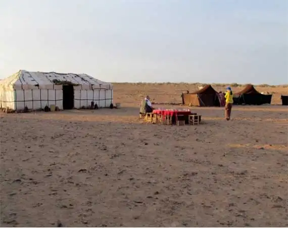 At 08:00 in the morning, leave Ouarzazate behind through Daraa alley to Zagora where you break the drive with a typical lunch. Carry on via Tamegroute where you will make an important stop to visit the Koranic library to M`hamid from which you will begin your camel trekking for 2 hours to land up in Erg Lihoudi desert camp. Have some time to walk in the desert and catch the brilliant sunset lying down behind the great dunes, why not try the sunbath experience. For the night, celebrate the new year with a Berber musical evening and have Mechoui for dinner.