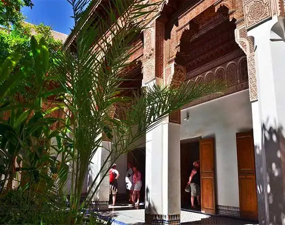 Today, get lost under the skin of `the pearl of the south` Marrakech city with a tour. Check out the Koutoubia Mosque, the reflection of a long rich history with its glorious earth-coloured minaret towering over the place. Then visit the 19th century Bahia palace the home of the sultan Ba Hmad down to the 16th century Saadin tombs before ending in the spectacular famous Jamaa El Fna Square, the heart of the ochre city and its live daily life shows, an actual masterpiece of the oral heritage of humanity as selected by the Unesco. Have a break, then go mingle inside the old alleys of the medina, home to blacksmiths, dyers, leather workers, sellers of spices with exotic scents, cabinet makers, tailors, and much more to discover.