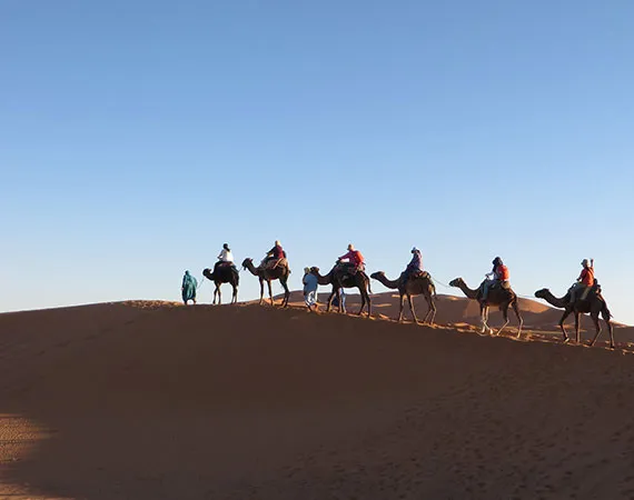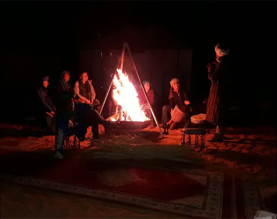 This morning travel from Tinghir on your south journey via Rissani, built near the legendary Sijilmassa, it is a market town very known for the dates. Have lunch at leisure, you follow the sandy yellowish road to Merzouga. Once you reach the spot, ride your camel while a mesmerizing sunset settles over the dunes, after you arrive at the camp, you will be welcomed by a traditional mint tea. Feast on a locally made dinner around a campfire, followed by singings and drums of the nomads under a starry sky, and end the day with an overnight in your tent at the foot of Erg Chebbi dunes.