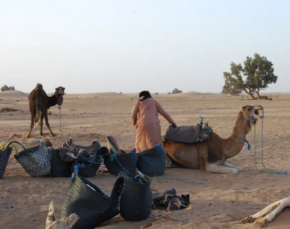 Start the journey along Jebel Tiffernine up through Tizi n’Tinififft mountain pass and make it into the mountain range of Saghro. You will travel across the Ksours and Kasbahs of the lush Daraa valley, from which you carry on to the village of M`hamid where you meet the cameleers. Enjoy lunch, then begin hiking leaving the palm groves behind and heading into the dunes of Rass Nkhel.