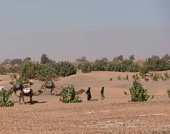 Follow the caravan route towards the dunes of Ait Ounir which is settled in the midst of sandy landscape and rocky regs with Tamarisk trees all over the plateau. In the far distance, you can catch the first appearing dunes of Erg Zaher and Daraa Hamada.