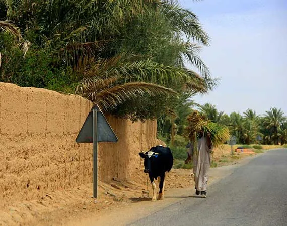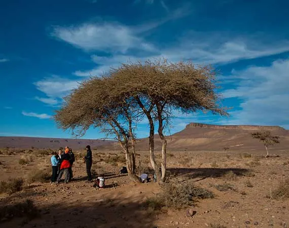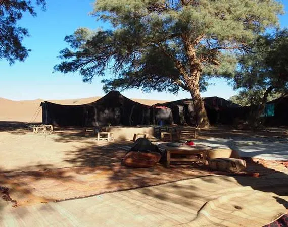 Rise early in the morning to embark on a couple of hours of walking, tuck in a locally made lunch under the shades of the African acacias. Shortly afterwards, you can gaze at the kraab mountain range making the borders with Algeria. Have a rest before we continue our walk to the tomb site of the spiritual leader Sidi Naji, a place sought by Sahraoui women to be lucky to find a husband. Have a relaxing night in a desert camp under an array of thousand stars in a nomad's tent.