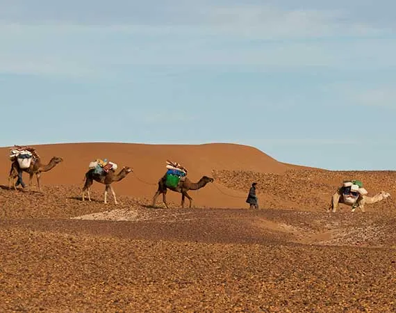 From Marrakech, you will have a desert expedition on foot for ten days, walk on regs, ergs, rocky plateau and sea of sand, uncover the life of caravans travelling on the pace of camels, be amazed at the stunning sunset laying behind the golden immense dunes, spend the night in camp between the dunes, or at the foot of the valley…Go for a lifetime experience which surely won`t come out of it the same!