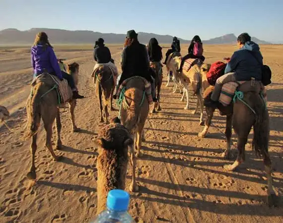 Savour a breakfast, then turn back to M`hamid on the back of a camel for 2 hours voyage. Have lunch in a traditional hotel in the palm grove. Later in the afternoon, you set off for a 60km ride to the dunes of Chegaga where you will be served a typical dinner and overnight in your desert camp.